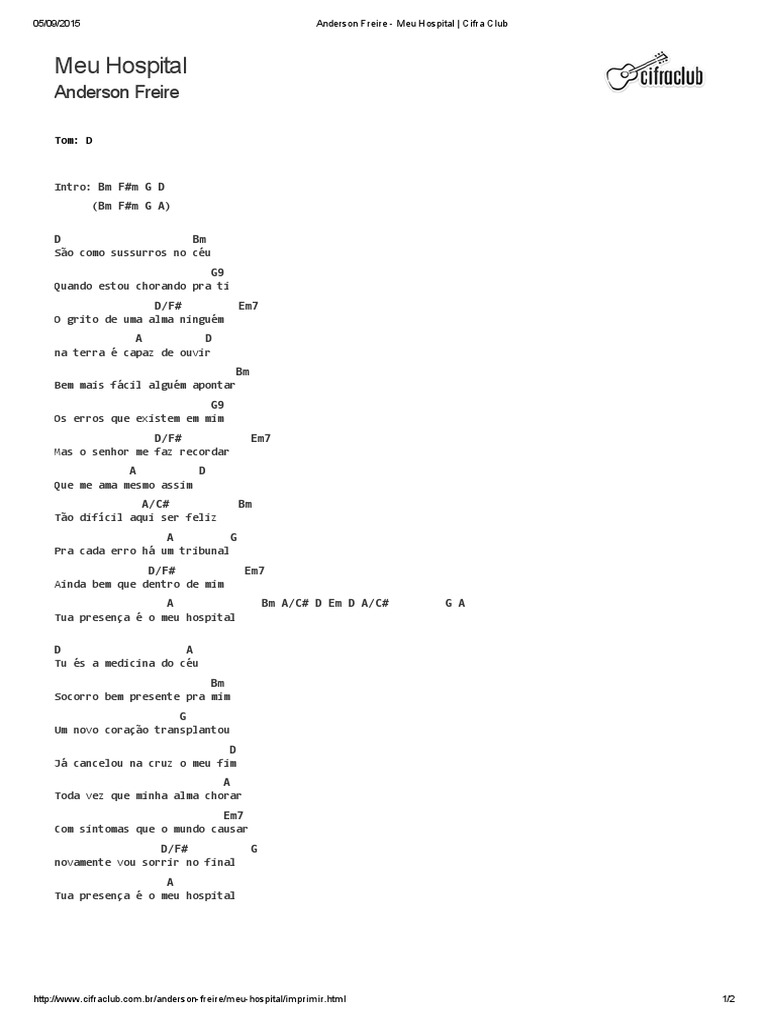 Aprenda a tocar essa música usando as cifras, tablaturas e versão simplificada com o cifras. Meu hospital anderson freire com letra legenda. Bm com sintomas que o mundo causar. D a tu és a medicina do céu. A (bm a d em d a) tua presença é o meu hospital. São tantos erros que cometi e o senhor não me transformou em réu são experiências que eu vivi hoje nada me separa do céu meu remédio é tua palavra, oh, senhor ela é mais doce que o puro mel sarado estou vivo para o teu louvor. Coração transplantou d já cancelou na cruz o meu fim a toda vez que minha alma chorar em7 com sintomas que o mundo causar d g novamente vou sorrir no final a tua presença é o meu hospital em7 d são tantos erros que cometi g e o senhor não me. For your search query meu hospital anderson freire playback e legendado mp3 we have found 1000000 songs matching your query but showing only top 20 results. Tu és a medicina do céu socorro bem presente pra mim um novo coração anderson freire meu hospital ouvir e baixar musicas gratis,busque entre milhares de musicas ,buscador de mp3 totalmente gratis. A g pra cada erro há um tribunal. Comment must not exceed 1000 characters. Este aplicativo não incluem áudio desta canção e facilitar usuário baixar essa música é ilegal. D a tu és a medicina do céu.